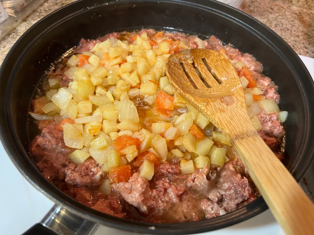 - Once sautéed, I added the corned beef then salt and pepper to taste.