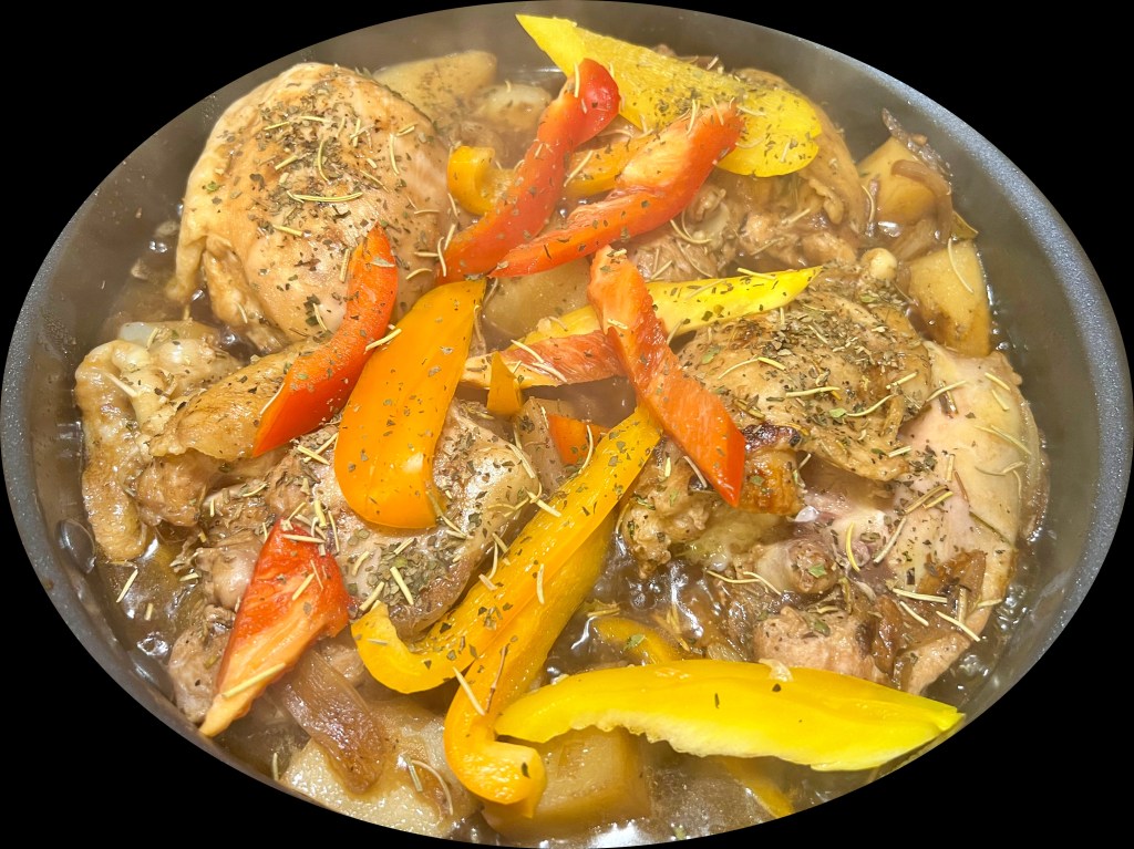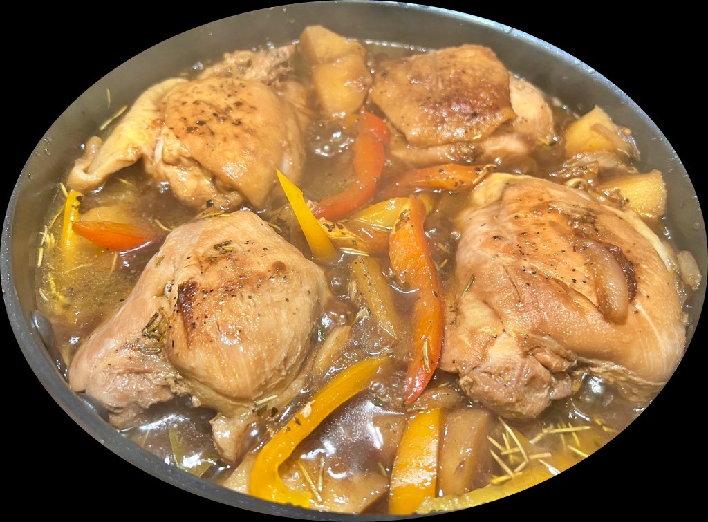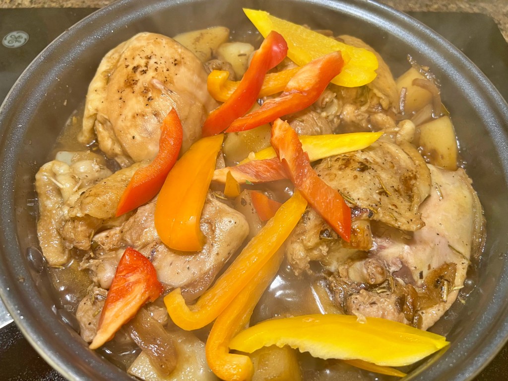 I flipped each thigh until I saw it’s a little brownish then I added a little soy sauce then the yellow, orange and red bell pepper.