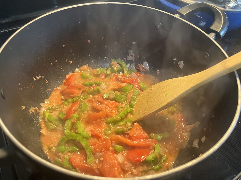 He sautéed them, adding the bitter gourd first and I did not ask him of his reason. Maybe because it’s bitter and he thought of paying more attention to it. He added shrimp paste next then all the vegetables.