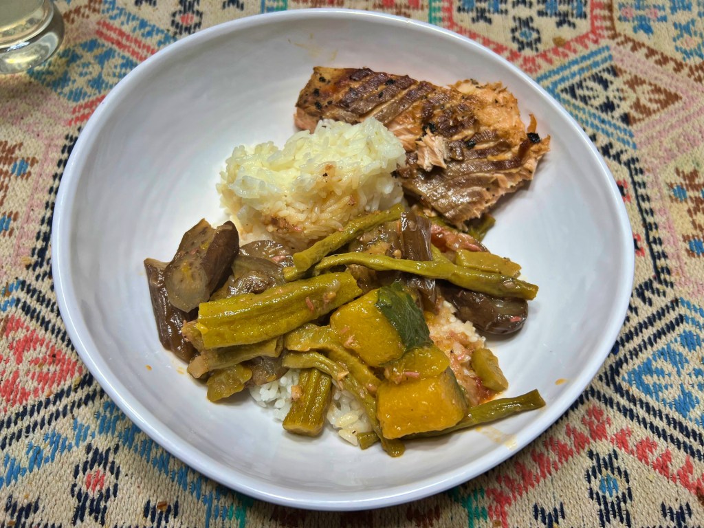 He finished cooking the dish quickly, was even able to grill Tilapia (rectangular plate) and Salmon (bowl) and it actually tasted delicious. Salute to him 🫡!