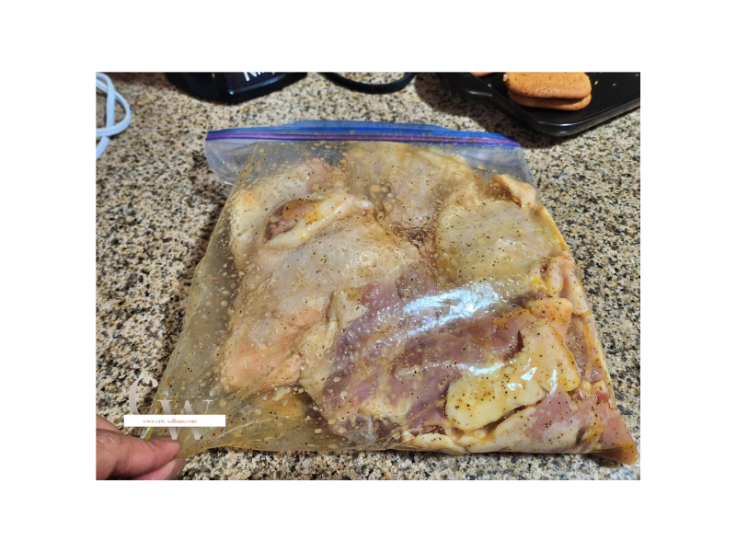 - Dipped the chicken thighs in the mixture then placed all meat in a resealable plastic container, let it marinade for few minutes.