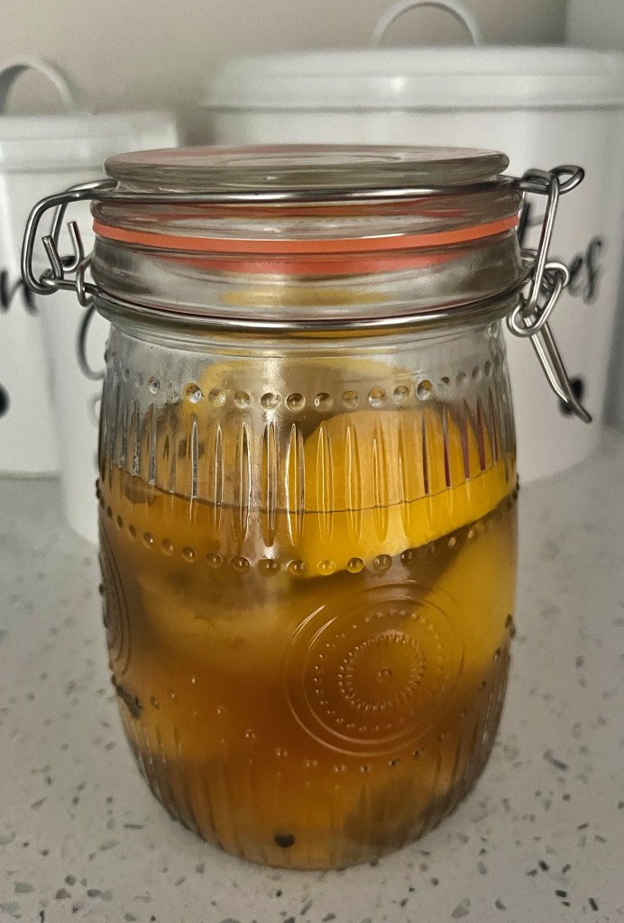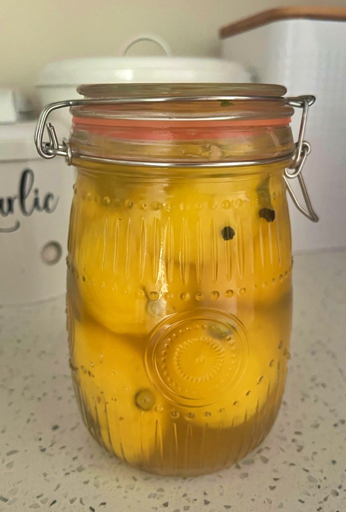 The following morning, I removed the lemons from the boiled water and noticed that it is already mixed with the lemon’s juice. Placed the mixture (lemon juice and cooled down boiled water) in a jar, added all the ingredients and made sure there is enough salt to make the lemons will be pickled properly. I left them in the jar for a while, checked every other day and when you see that the lemons are getting brownish in color, that was when I start checking the texture of the lemons. Once tender, I start enjoying them.